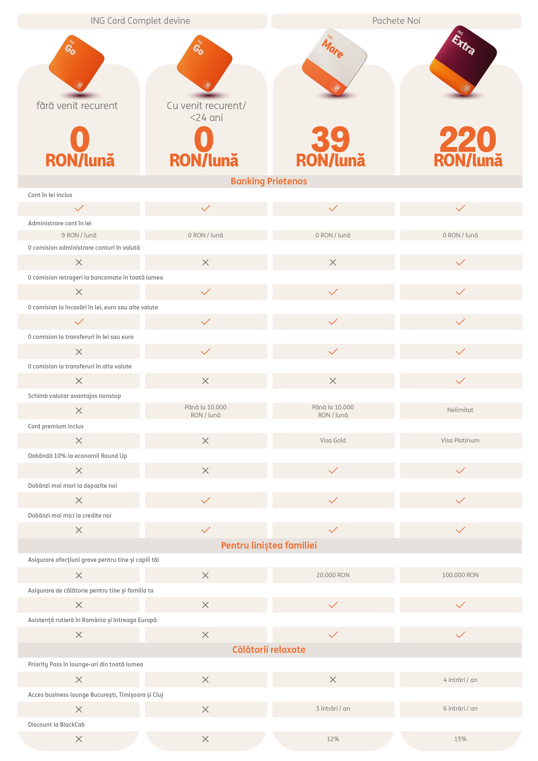 Nu mai folosim denumirea ING Card Complet pentru contul nostru curent în lei, care va fi parte din pachetul ING Go. Nicio grijă, atât conturile tale curente în lei, cât și cardurile atașate acestora rămân la fel ca până acum.