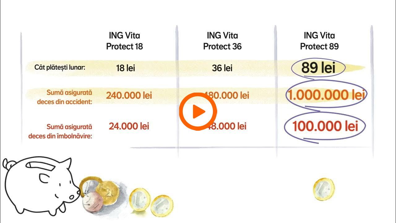 Poate că mai înspăimântător decât gândul că într-o zi ți se poate întâmplă ceva e gândul că cei dragi rămân fără tine. Cu asigurarea de viață ING Vita Protect, ai confortul de a ști că în astfel de cazuri familia ta va fi cu o grijă în minus din punct de vedere financiar.